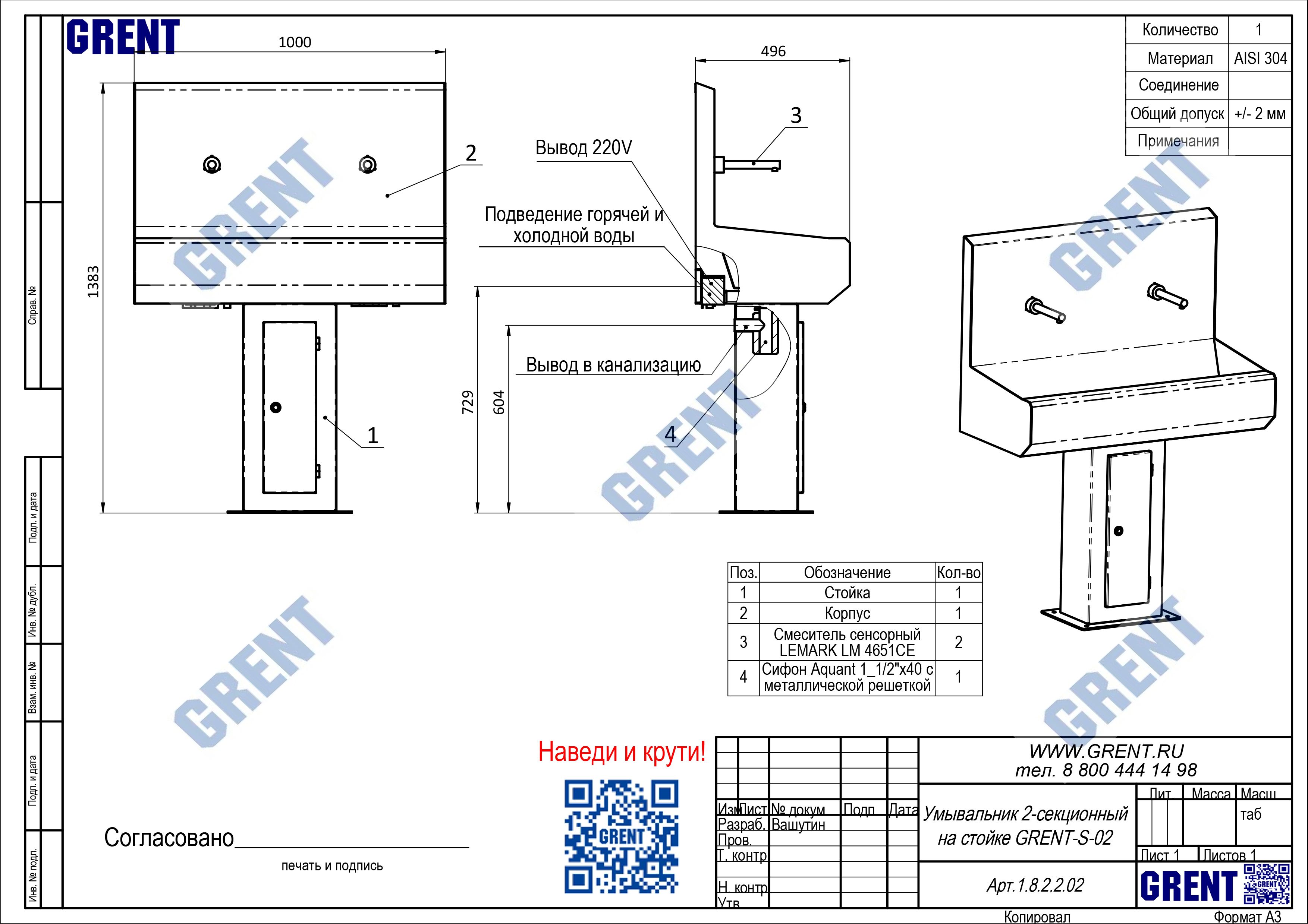 Двух секционный умывальник GRENT-S-02 используется для бесконтактной мойки рук персонала преимущественно на предприятиях общепита и пищевой промышленности. Активация подачи воды осуществляться фотодатчиком при поднесении рук к смесителю.